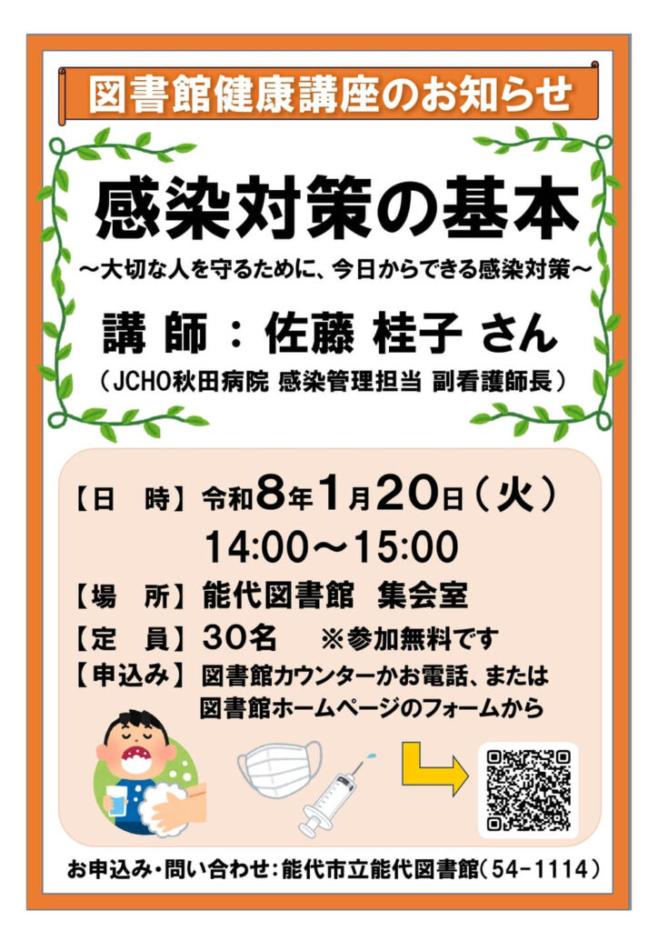 イベント 図書館健康講座を開催します 今回のテーマは「感染対策の基本~大切な人を守るために、今日からできる感染対策~」です。 JCHO秋田病院から講師をお招きして感染症や感染対策に関するお話をしていただきます。 概要 ■日時 2026年1月20日(火) 14:00~15:00 ■場所 集会室 ■講師 佐藤 桂子さん(JCHO秋田病院 感染管理担当 副看護師長) ■定員 30名(事前申込) 申込方法 電話(0185-54-1114) 能代図書館カウンター お申し込みフォーム(外部サイトに移動します)