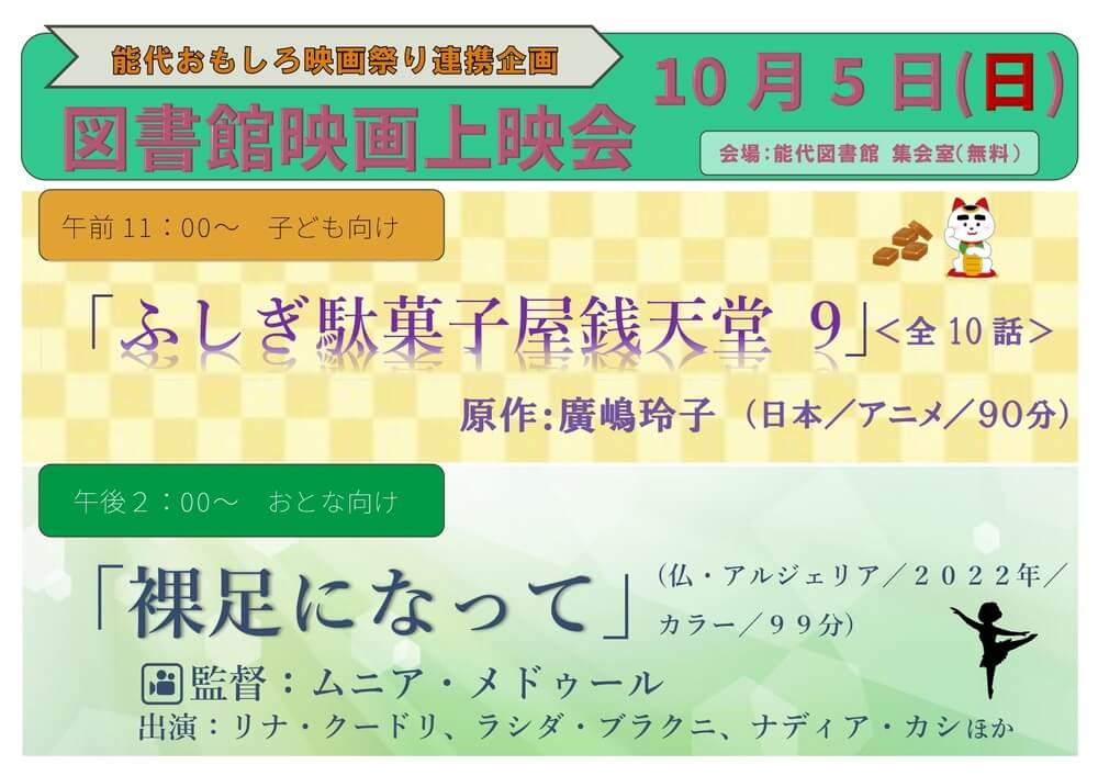 おはなし会・映画上映会 10月の映画上映会はこちら 図書館映画上映会とは 能代図書館では毎月第3日曜日に上映会を開催します。(変更する場合もあります。) 場所は能代図書館集会室です。 申込は不要で、無料です。どなたでもご覧いただけます。