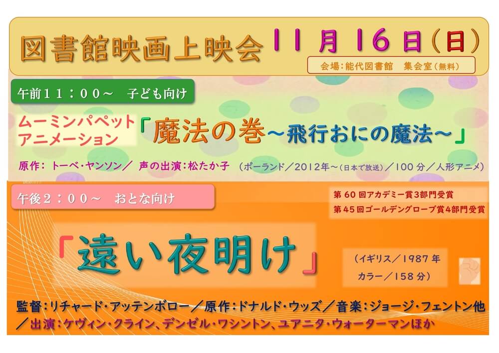 おはなし会・映画上映会 11月の映画上映会はこちら 図書館映画上映会とは 能代図書館では毎月第3日曜日に上映会を開催します。(変更する場合もあります。) 場所は能代図書館集会室です。 申込は不要で、無料です。どなたでもご覧いただけます。