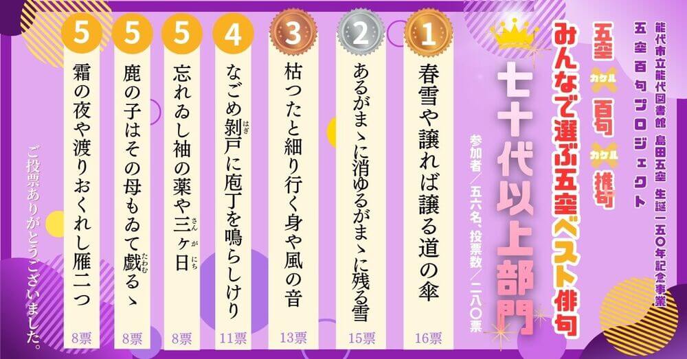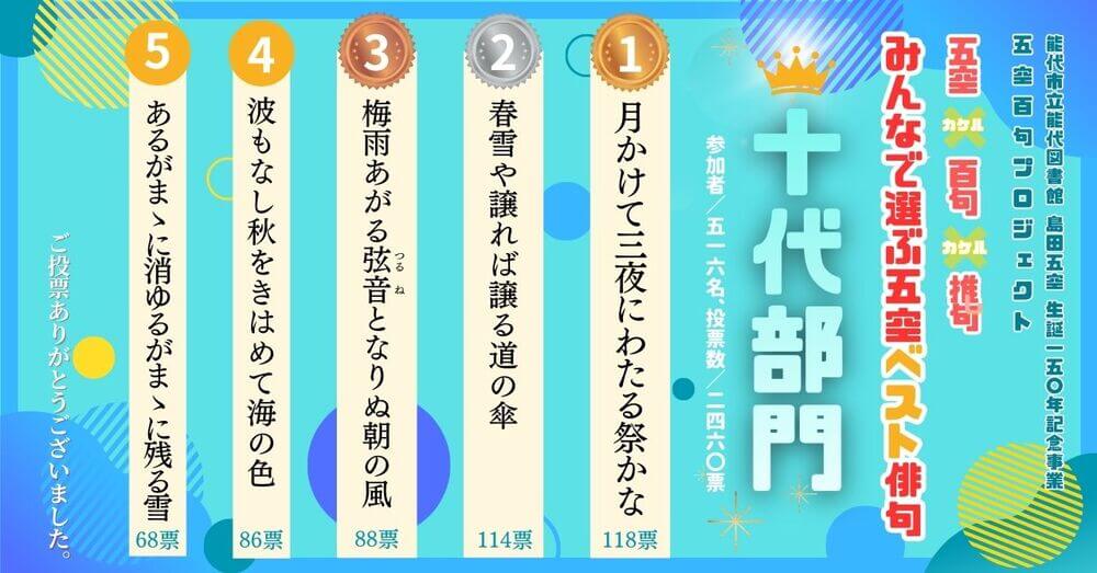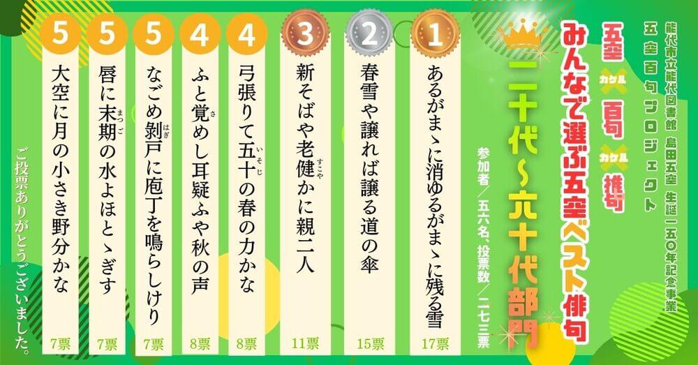 お知らせ イベント 五空百句プロジェクト【五空×百句×推句 みんなで選ぶ五空ベスト俳句】結果発表!! 島田五空の生誕150年を記念して編んだ「五空百句」を活用した選句イベント 「五空×百句×推句 みんなで選ぶ 五空ベスト俳句」結果発表です!!!!! →「五空百句」とは? →「五空×百句×推句 みんなで選ぶ五空ベスト俳句」とは? 参加者総数:628名、投票総数:3,013票 能代市内からはもちろん、県外、海外からもご投票いただきました。 あなたが投票したお気に入り俳句は果たしてランクインしているでしょうか!? ▼ ▼ ▼ ご参加くださった皆々様、誠にありがとうございました!! 全句の投票結果はこちら ご感想コメントはこちら