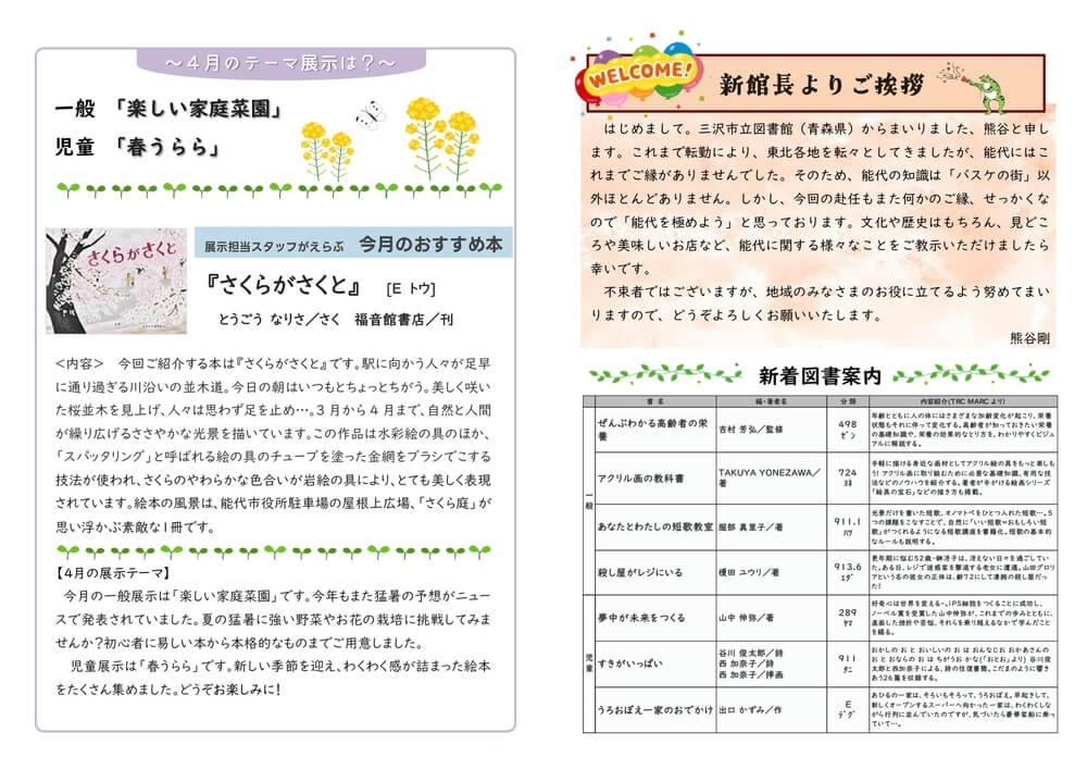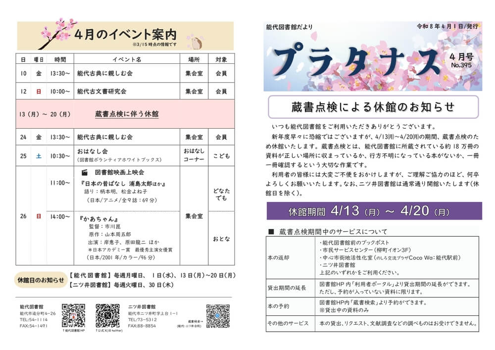 能代図書館だより 「プラタナス」2026年4月号
